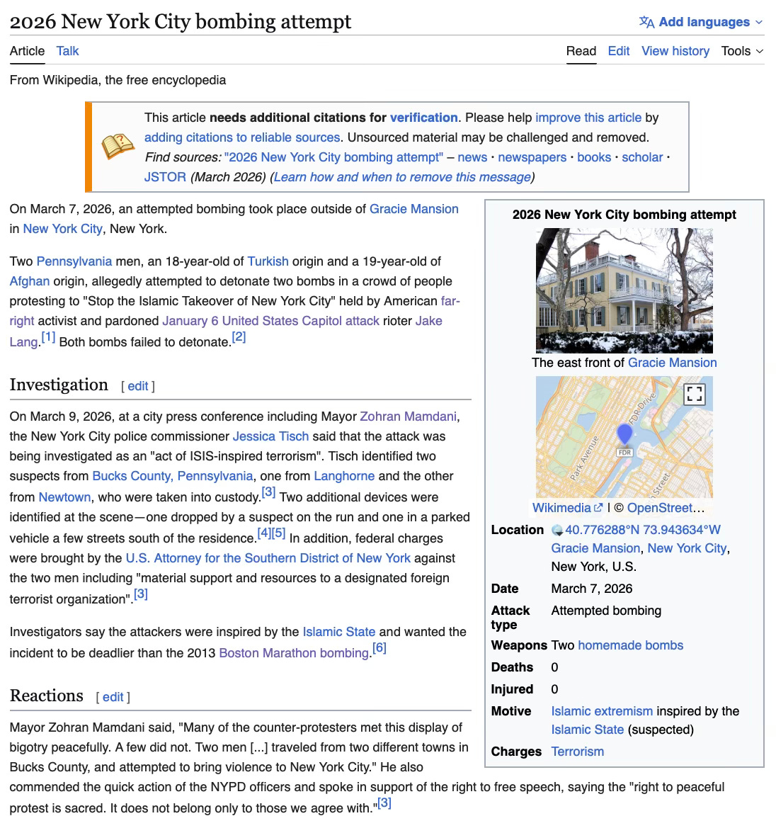 If you check the Wikipedia article for this story, Jacob Lang — who, whatever you think about the man, was a victim here — is mentioned by name. But the two attackers are not. There are no details about the bombs. No mention of Mamdani’s speech or the egregious media missteps. The article says the attackers “allegedly” tried to detonate bombs and refers to them as “suspects.” But again, we have them on film carrying out the attack. We know their names. We know they did it. Wikipedia’s leftist bias has been obvious, and studied, for some time now, but it’s been getting worse as of late. It used to be that for incidents like this, Wikipedia was a rich mine of data, often more comprehensive than any news article. But now that woke editors have largely taken over, it is often barely worth glancing at anymore.