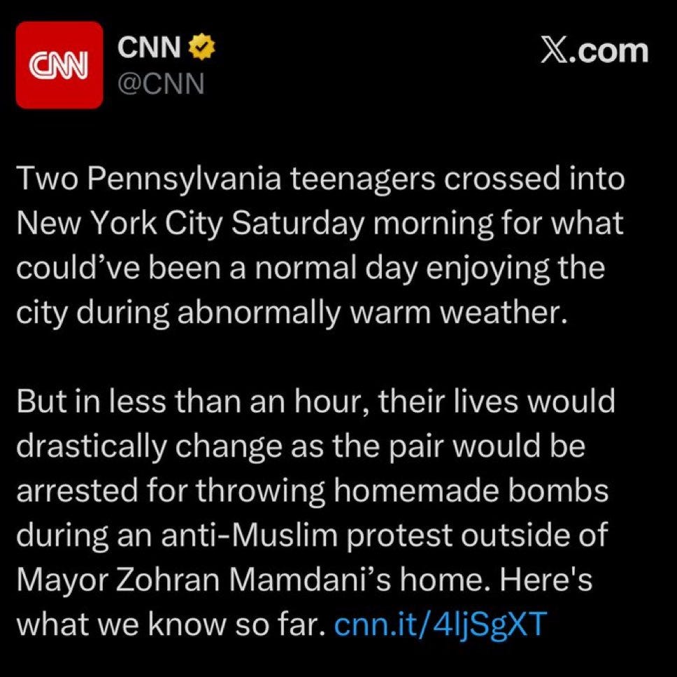 Mainstream news did what mainstream news reliably does by warping the facts beyond recognition in the most grotesque manner. CNN initially described the horrific attack on X as if the two terrorists were just a couple of regular American teens trying to enjoy the warm weather. Separately, CNN news anchor Abby Phillip initially described the event as an attack against Mamdani, rather than against the anti-Islam protesters. The X post was later deleted and Phillip later apologized, saying she made an “error.” But never mind that there was clear footage of the event and it went viral immediately. Never mind that Phillip is not some Disney-brained TikTok influencer, but a CNN anchor and former White House reporter from whom we should expect better. All that aside, these “errors” always go in the same direction.
