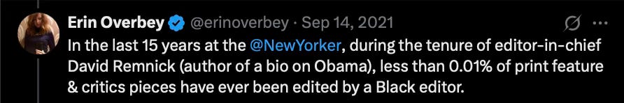 Perhaps what we are seeing with the racist writers at the New Yorker perhaps has less to do with race per se but rather is more about charting the demonic in our culture. Racism is most offensive, in my view, because it reduces the targeted person to a biological entity with certain immutable characteristics. And, based on that reductionist view launches hatred and ridicule and power moves. In contrast, one who truly sees the other person, of whatever race, as a soul, transcends the demonic and finds reason to love. Seeing the divine in the other is a higher order skill and viewpoint, one which should prevail over demonic racism. There is irony in the view that one is a soul, in essence, and the body is merely a vehicle. Those who imagine reincarnation is an option realize that in one incarnation one might be black, in another, white, and so on. So one ends up hating former and future selves based on the chosen vehicle. We would laugh at someone who made vehicle choice a cultural touchstone... but that is what demons do. There are no strong voices, unfortunately, pointing out that the true degradation of racism is its demonic quality. One should not label them racist but rather demonic.
