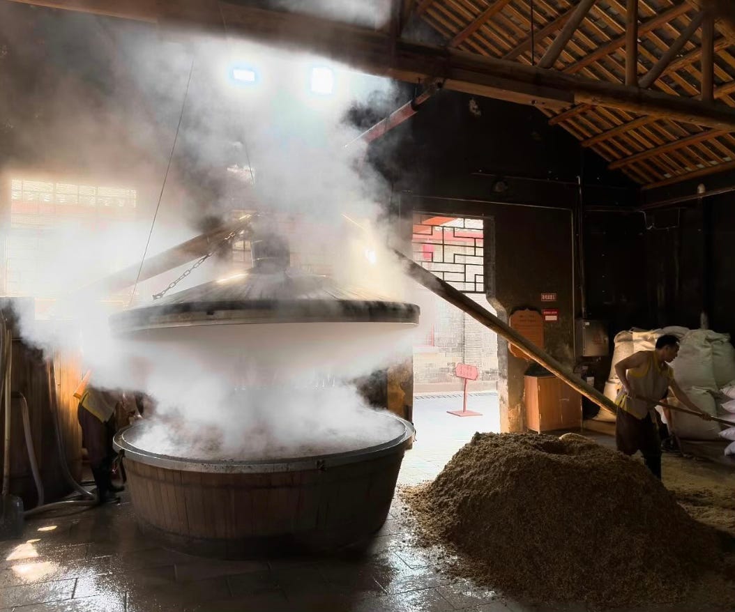Moutai comes by its astonishing complexity via a production process unlike anything I’ve seen in the West. Made mostly from sorghum and a little bit of wheat, it undergoes a fermentation process that includes the steaming of the sorghum, amassing it into a giant mound where it starts to ferment (like a compost heap), burying it in a pit for a month, pulling it out, distilling some of the alcohol out of it, and repeating this process seven times. Where the fermentation process for grain used in a batch of whiskey takes around a week, the process for Moutai runs over six months. After distillation, the spirit is aged in ceramic vessels for an average of five years.